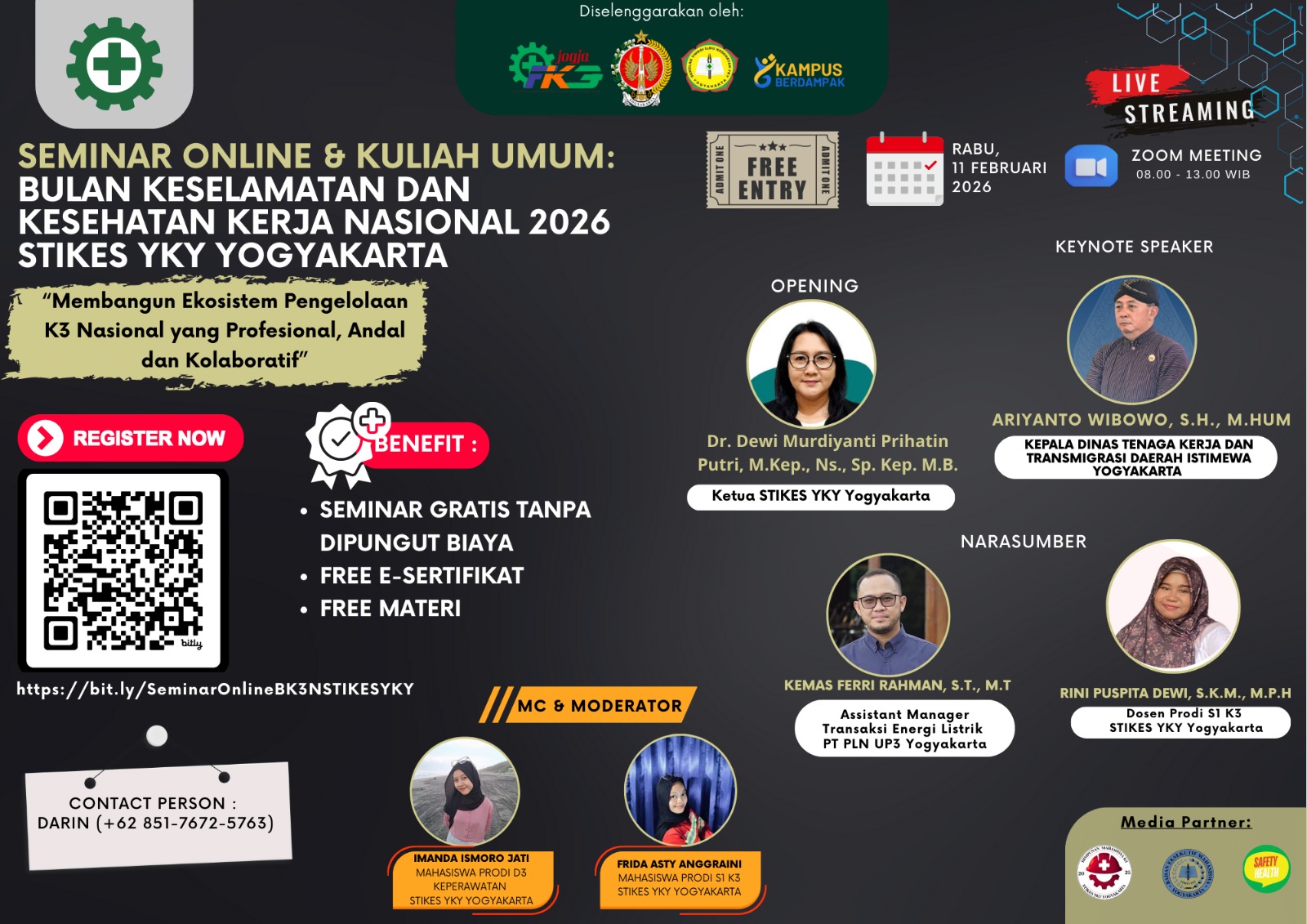 Dalam rangka memperingati Bulan Keselamatan dan Kesehatan Kerja (K3) Tahun 2026, STIKES YKY Yogyakarta menyelenggarakan Seminar Online & Kuliah Umum sebagai wadah edukasi, diskusi, dan kolaborasi dalam meningkatkan kesadaran serta pemahaman mengenai pentingnya K3 di berbagai sektor. Dengan Tema "Membangun Ekosistem Pengelolaan K3 Nasional yg Profesional, Andal dan Kolaboratif"